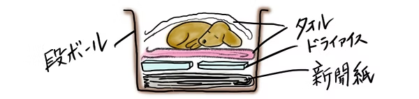 ご遺体より一回り大きな段ボールなどに新聞紙、タオルに包んだ保冷剤(ドライアイス)の順番で敷き、バスタオルで包んだご遺体を置いてあげます。
